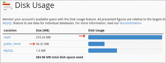 3. In Disk Space Usage area you can see which folder/directory is using too much space and you can even check the disk usage of MySQL.