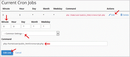 3. Scroll down to the end of page and under "Current Cron Jobs", locate your cronjob and then "Edit" .