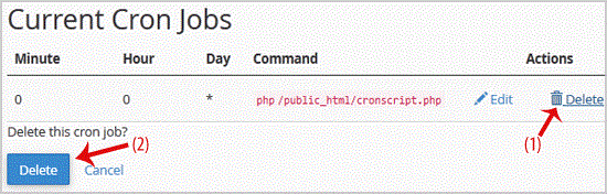 1. Under "Current Cron Jobs", locate your cronjob and then click on "Delete"
