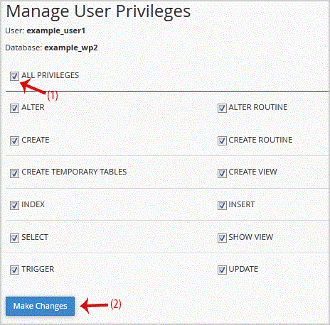 5. On "Manage User Privileges", mark the box "ALL PRIVILEGES" and click on "Make Changes".