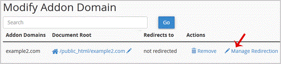 3. Under "Modify Addon Domain", locate the addon domain and click on "Manage Redirection".