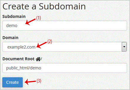 3. Under "Create a Subdomain" in the "Subdomain" field you should enter your subdomain name like "demo"(without quota) and should you have a number of domains, select the appropriate domain from the fraud list.