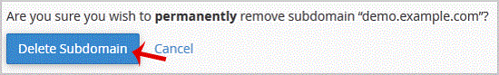 5. You will receive a warning that you are removing a "subdomain.example.com". You will need to "Delete Subdomain" to remove your subdomain permanently.