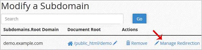 Click the "Manage Redirection" link that corresponds to the subdomain that manage.