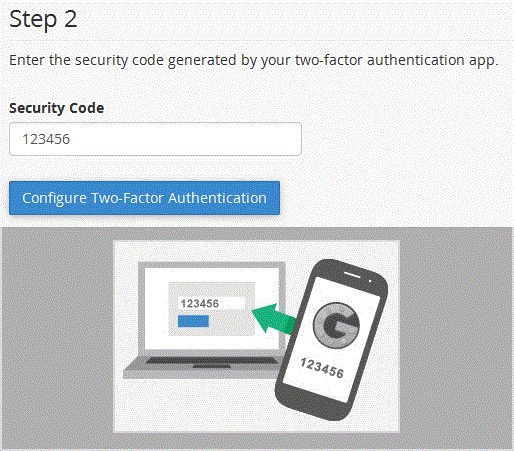 In Step 2, under the "Security Code" text box, enter your Two-Factor Authentication code and click the "Configure Two-Factor Authentication"