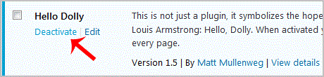 3. If you want to deactivate the "Hello Dolly" plugin, for example, click on "Deactivate", which appears at bottom of the "Hello Dolly" text.